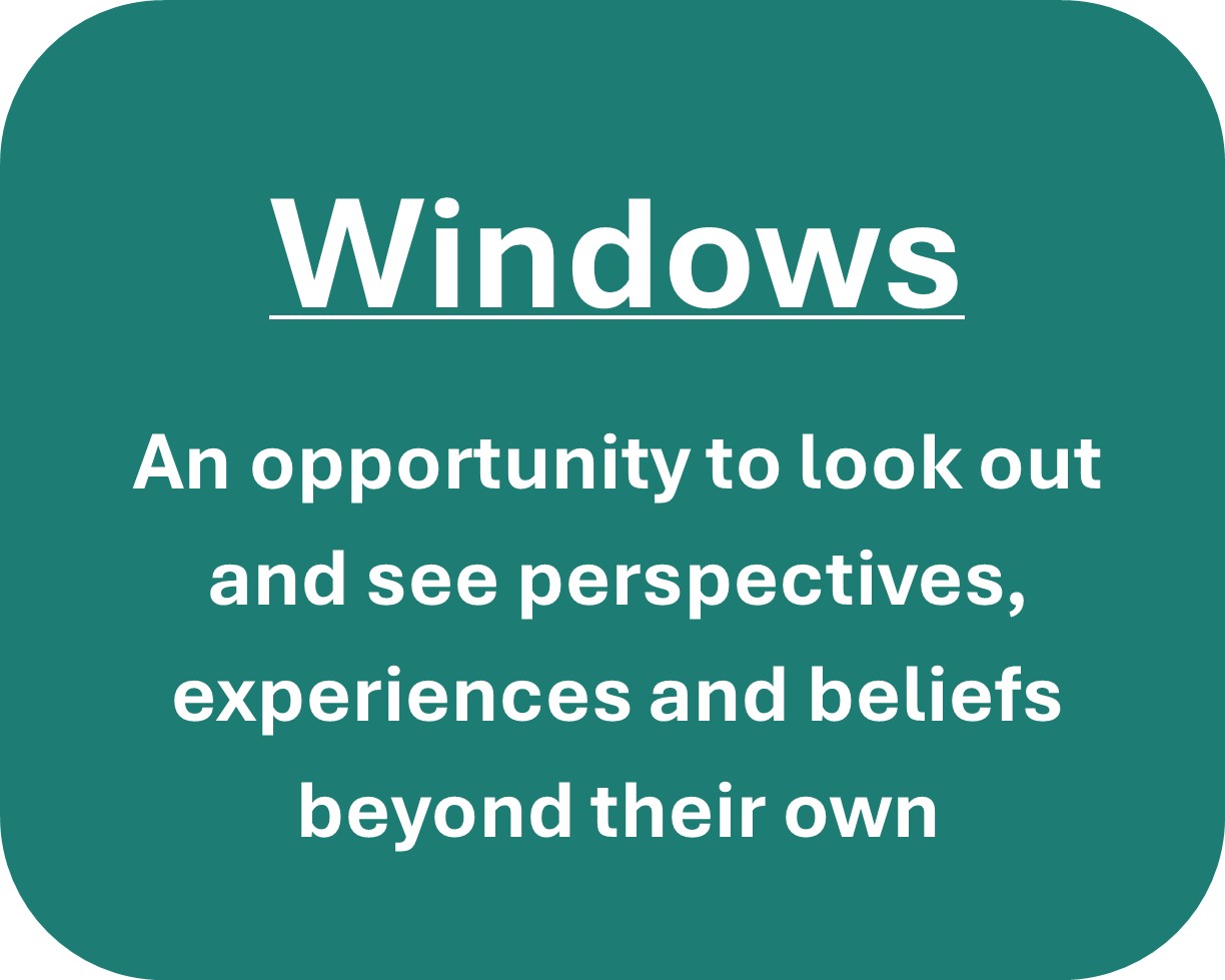There are many approaches and tools to support embedding spirituality in schools. One of these approaches is the windows, mirrors, doors approach which is a well known metaphor originally developed by Dr. Rudine Sims Bishop.